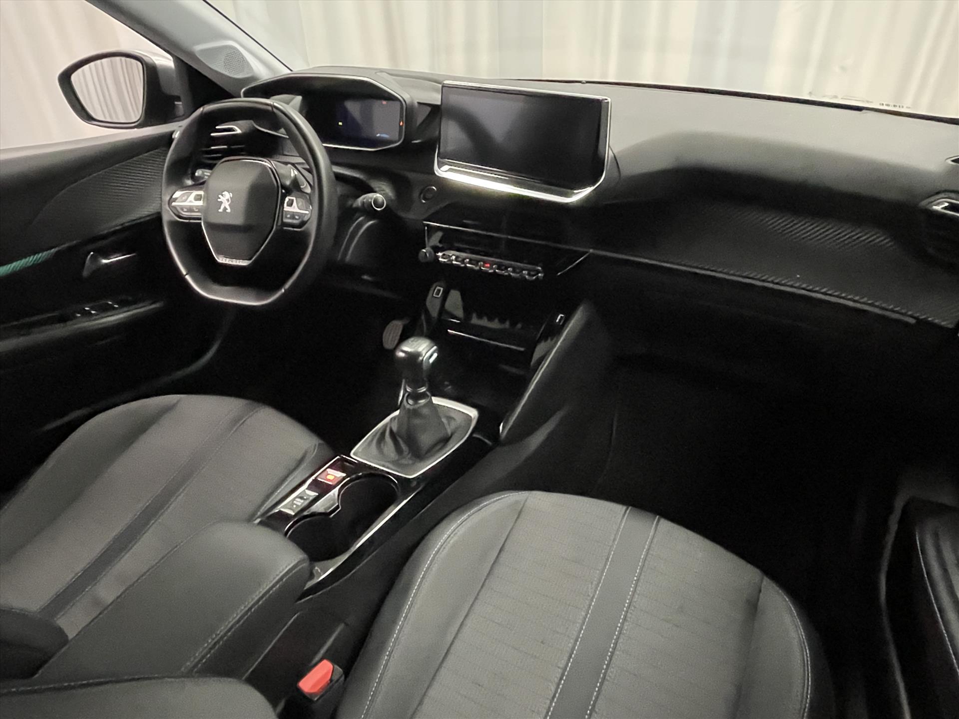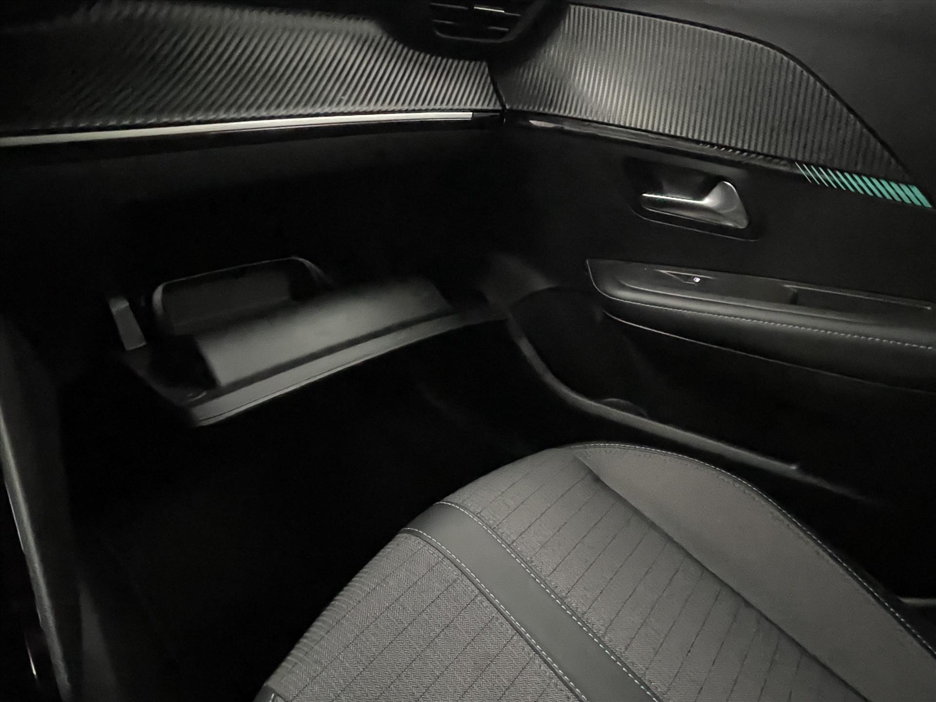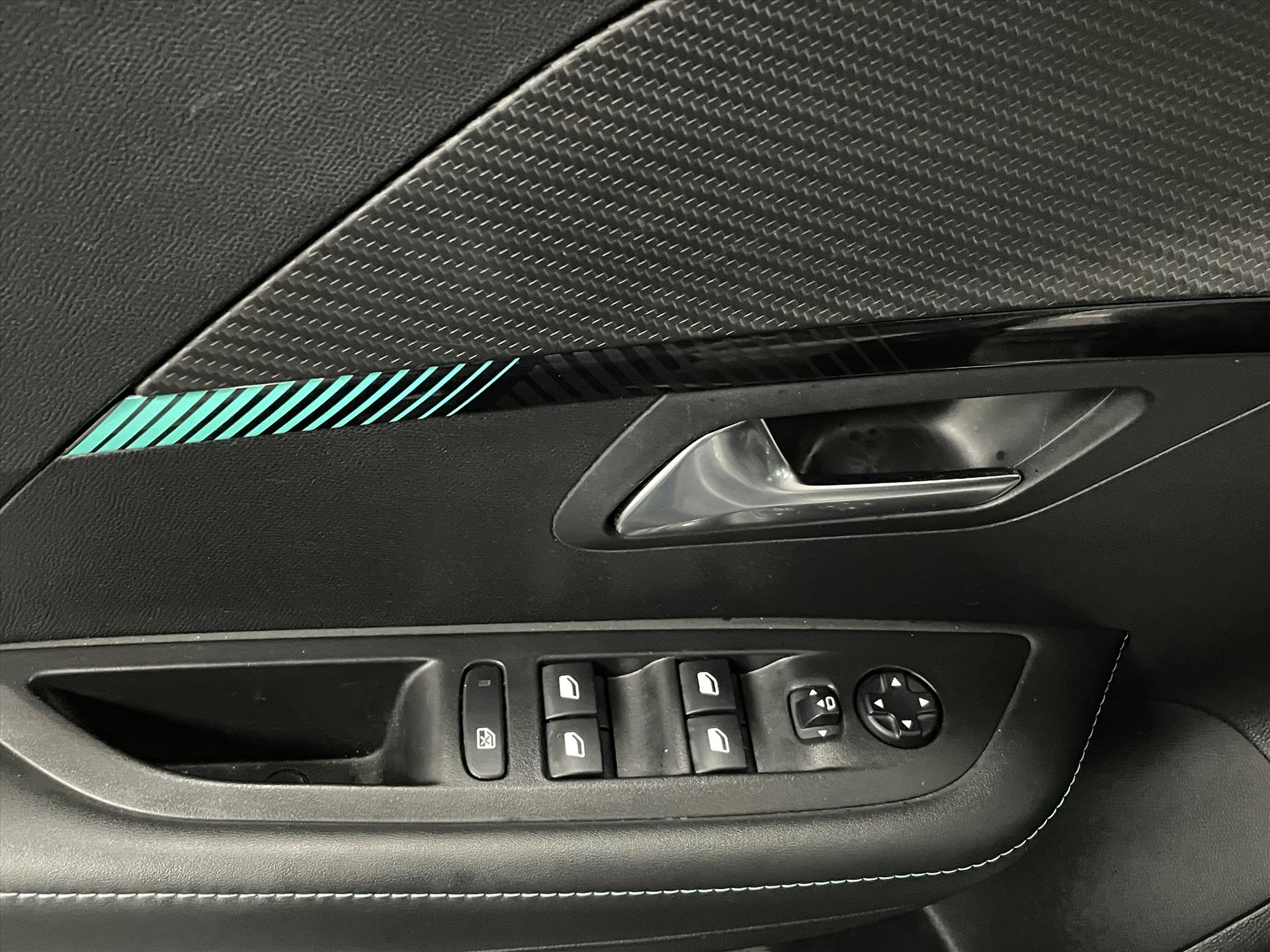 Dashboard in zacht materiaal met carboneffect en hoogglans zwarte sierstrip met chromen bies