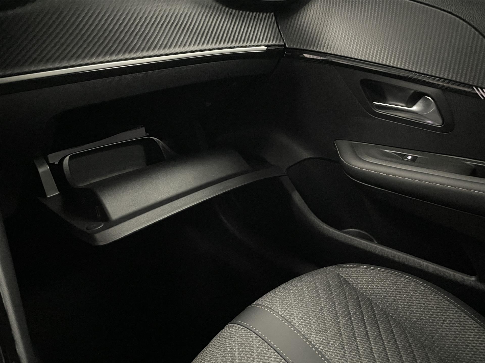 • Dashboard in zacht materiaal met carboneffect en hoogglans zwarte sierstrip met chromen bies